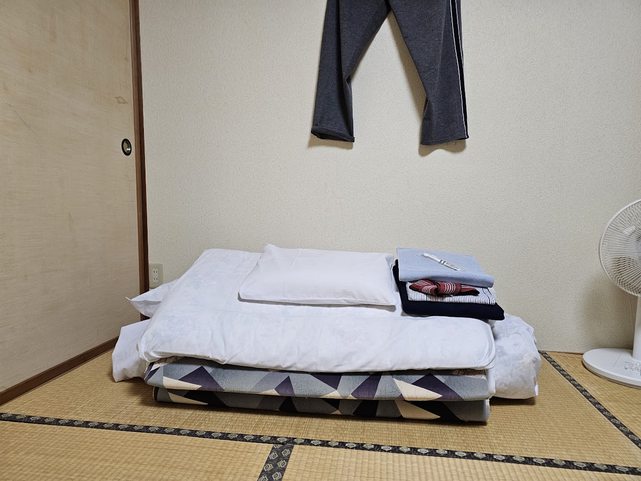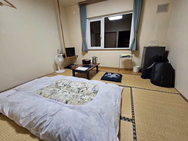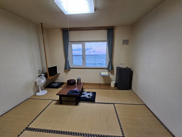 房間是日式榻榻米房,因為也是北方離島,沒有冷氣,只有電風扇。房間沒有廁所和浴室