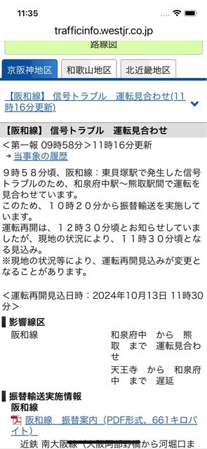 搭JR往關西機場請注意車次 目前訊號故障 只行駛到鳳站 恢復時間請詳見JR西日本官網