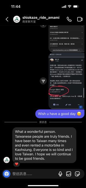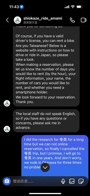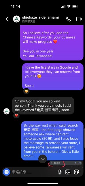 我立刻興奮的私訊給店家問可否線上預約,順便建議他可以把Google關鍵字多 「奄美 機