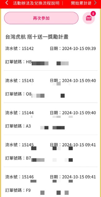 八個訂位代碼跟最後累計次數一樣都是八趟!然