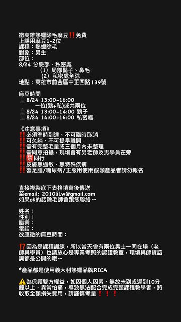 標題「免費」徵求熱蠟除毛模特(限男性)