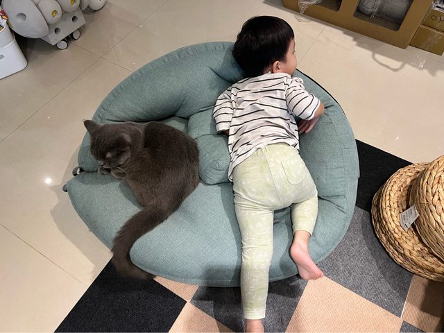 有小朋友小貓躺著當比例