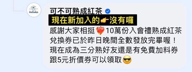 推 abeabeabe: 剛加入,只收到4張券,沒有免費紅茶券 36.232.151.94 10/26 02:50