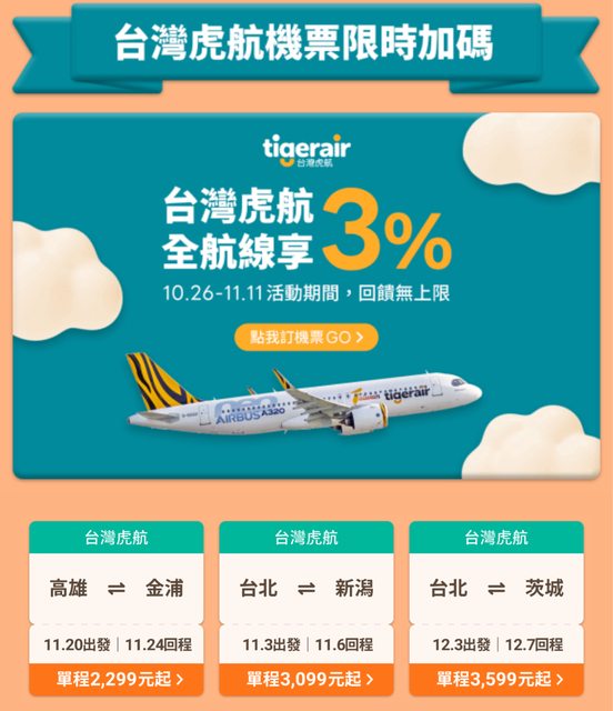 在line旅遊線上旅展期間(10/26-11/11)購買台灣虎航機票天天享3%點數回饋無上限