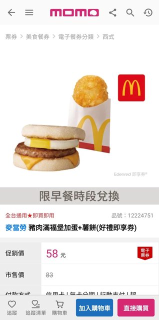 momo購物網 麥當勞豬肉滿福堡加蛋跟薯餅58元 每個人只能買一份 有需要的可以去買 https://i.imgur.com/4yHzmjI.jpg