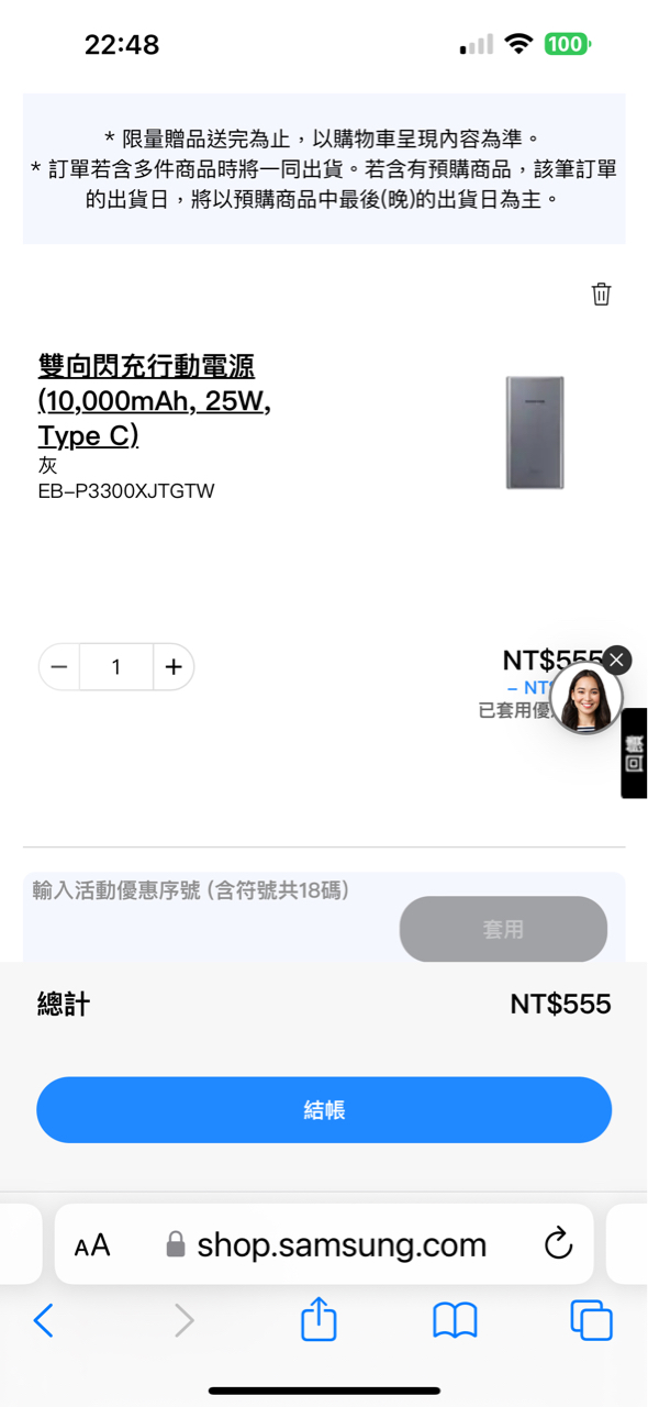 推 pogxx0330: 借問一下,三星商城買了是不會馬上有訂 219.70.122.232 01/18 01:00