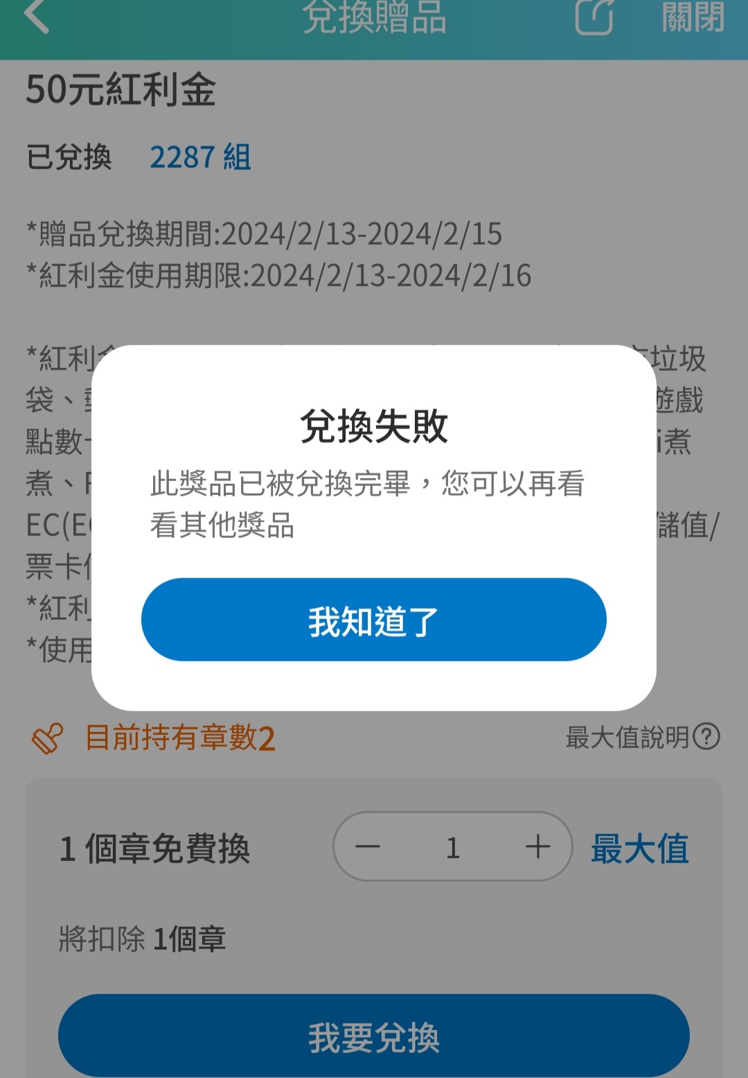 推 wwyyll: 我剛按兌換也顯示已兌完,但紅利金有出現 223.137.56.123 02/14 11:20