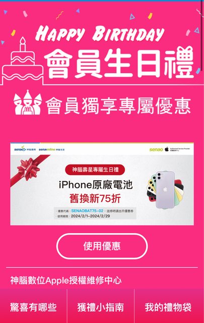 推 poo731013: 可以加入會員等生日到可以領取 42.77.80.222 02/16 18:15
