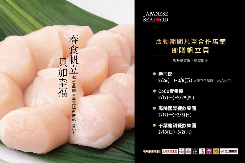 https://www.facebook.com/photo?fbid=793895666109685&set=a.484210043744917 @ 台湾スシロー 台灣壽司郎 【壽司郎JFOODO,邀您免費品嚐日本直送帆立貝】 以絕對超群的新鮮度與品質,征服老饕味蕾的日本產帆立貝 口感緊實柔軟、味道鮮甜,咬下瞬間彷彿讓人置身海洋 壽司郎攜手JFOODO 活動期間來壽司郎用餐, 即可獲得免費帆立貝壽司一貫.人氣寶「貝」不等人,邀您一同加「貝」幸福 活動日期 活動期間:2/26(一)~3/8(五)平日限定(含2/28,不含六日) 活動辦法 活動期間至台灣壽司郎店内用餐,每人贈送一貫帆立貝壽司。數量有限送完為止 注意事項 ●當日來店消費,一位贈送一貫,兩位贈送兩貫,以此類推。 ●每人每日限贈送一次。活動僅限平日,六日恕不贈送。 ●外帶外送恕不贈送。 ●期間限定活動,商品數量有限送完為止,以各店實際銷售狀況為主,恕不另行公告。 ●台灣壽司郎與JFOODO保有活動最終解釋權及隨時修改、終止活動的權利,  如有異動以台灣壽司郎粉絲專頁公告為主。 全台壽司郎店舖 店舖一覽,歡迎來電預約外帶https://www.sushiro.com.tw/Shop 壽司郎專屬訂位APP IOS https://lihi1.com/1nBdp Androidhttps://lihi1.com/3rXKd 關於JFOODOJFOODO(日本食品海外推廣中心)為擬定與實施日本產農林水產品與食品, 在海外之品牌塑造與宣傳戰略之日本政府轄下專門機構。 https://www.jetro.go.jp/en/jfoodo/ -- ※ 發信站: 批踢踢實業坊(ptt.org.tw), 來自: 111.254.23.109 (臺灣) ※ 文章網址: https://ptt.org.tw/Lifeismoney/M.1708973145.A.077