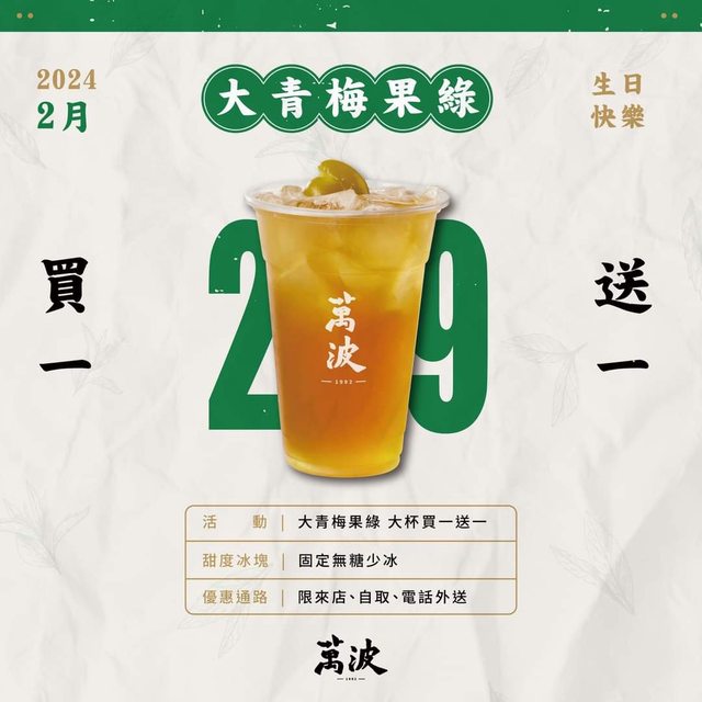 #預備衝 / 一日限定!    #大青梅果綠 「大杯無糖少冰」買一送一 僅限「來店購買、電話外送、自取」 不能與其他優惠合併使用,其餘購買管道不適用 注意: 1.優惠數量有限,以現場銷售為準,且依門市現場營業時間為準 2.此活動不包含台南三井百貨店及公休門市 3.萬波島嶼紅茶保有此活動最終解釋、最終修改、變更及取消之權利 -   https://i.imgur.com/8Ea1XgS.jpg