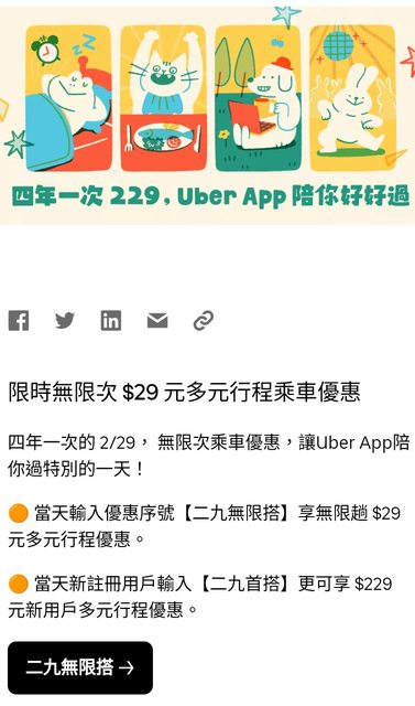 標題[情報] Uber 2/29 當日優惠無限次折29 首搭折229