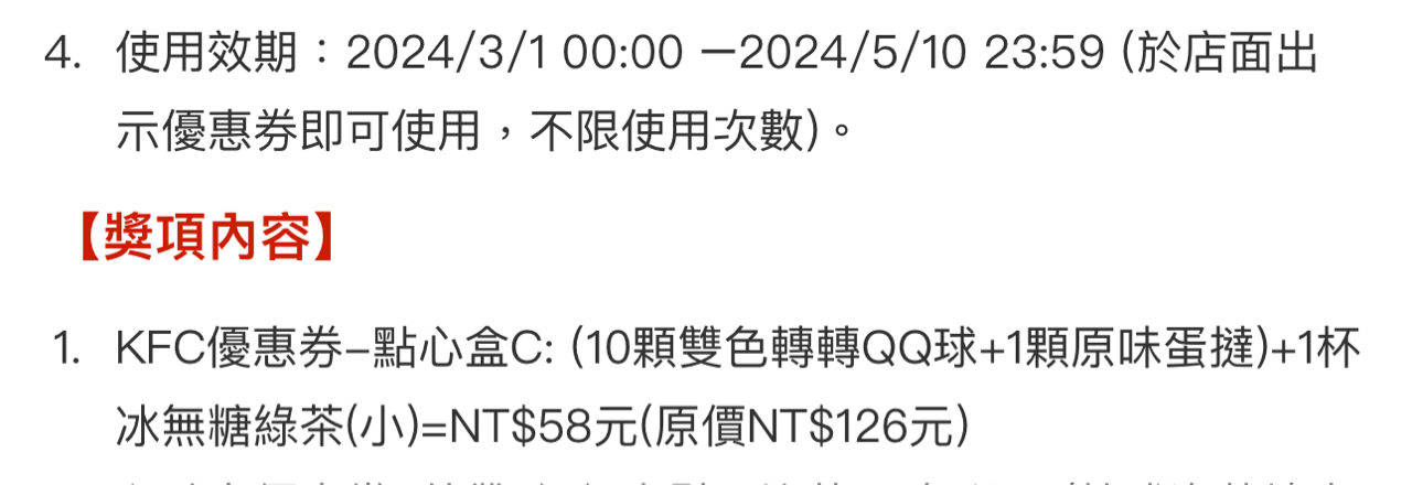 自從炸雞現在要60-70元, 都是用優惠碼 但這組合, 可以有1炸雞2雞塊+1玉米濃湯(或雞汁飯) 對我這種已在外面手搖飲店, 買好飲料的人很適合 XD 若覺得不夠便宜的請鞭小力點, 我不是業配!可查本版我的舊文。 https://reurl.cc/mrgzAA $89超雞賞 A+B 自由搭配 只要$89 2024/03/05 A+B 自由搭配,只要89元! 肯德基給你雞的多樣經典選擇, 89元就能吃到肯德基經典明星產品, 還有多樣化副餐隨你選, 滿足你的不同的需求。 馬上到肯德基點$89超雞賞, 任你搭配,怎麼吃都划算! 活動時間:3/5開始 A區多樣經典脆雞主餐: 咔啦脆雞+2塊上校雞塊、 美式煙燻咔脆雞堡、 8塊上校雞塊、 煙燻起司雞柳捲四種 B區甜鹹任選配餐: 中杯飲料、 玉米濃湯(小)、 香酥脆薯(小)、 雞汁風味飯四種 兩區各選一個只要89元, 自由配出你想要的超值! — 另外有6個指定店家 提供「上校塔可脆雞堡、上校照燒脆雞堡」, 給你A區不一樣的選擇 指定店家: 台北承德、板橋新埔、 桃園大興西、台中永福、 台南西門二、高雄三多 A區多樣經典脆雞主餐: 上校照燒脆雞堡、上校塔可脆雞堡、 咔啦脆雞+2塊上校雞塊、 8塊上校雞塊四種 B區甜鹹任選配餐: 中杯飲料、玉米濃湯(小)、 香酥脆薯(小)、雞汁風味飯四種 -- ※ 發信站: 批踢踢實業坊(ptt.org.tw), 來自: 223.137.128.72 (臺灣) ※ 文章網址: https://ptt.org.tw/Lifeismoney/M.1711211554.A.AA6