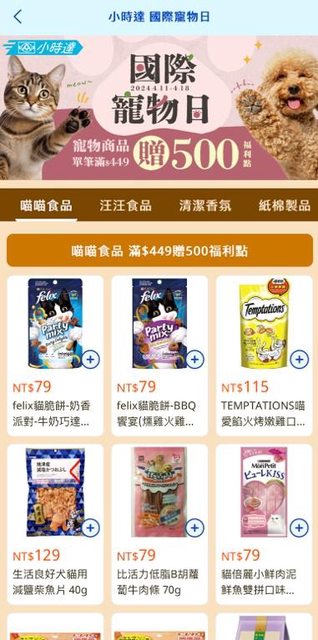 內容:購買寵物類商品消費滿449元加贈500點全聯福利點,一樣換算下來接近88折