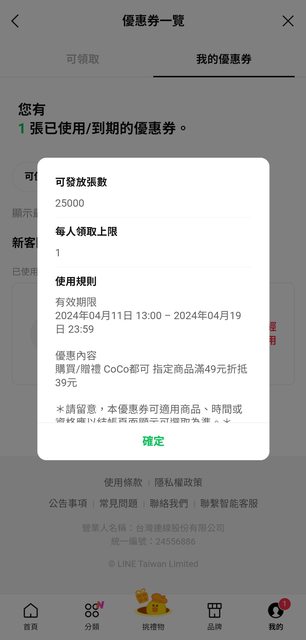 Line禮物有CoCo優惠券(新客限定) 滿49折抵39 限量25000張 https://i.imgur.com/noGRtfe.jpg