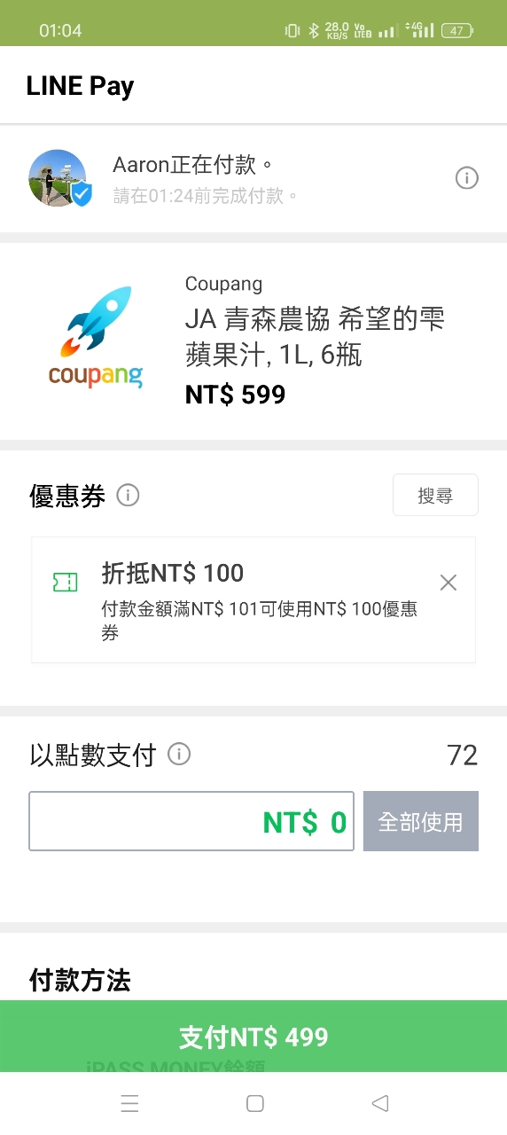 aaronses7118: 酷朋錢100之後linepay再減100 共499 27.51.81.55 04/17 01:07
