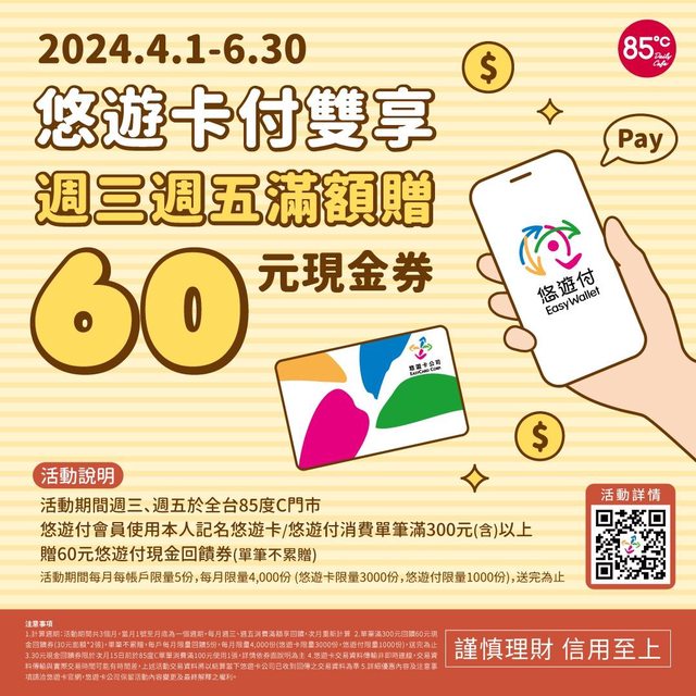 活動期間每週三、週五,消費滿300贈送60元悠遊付現金回饋卷