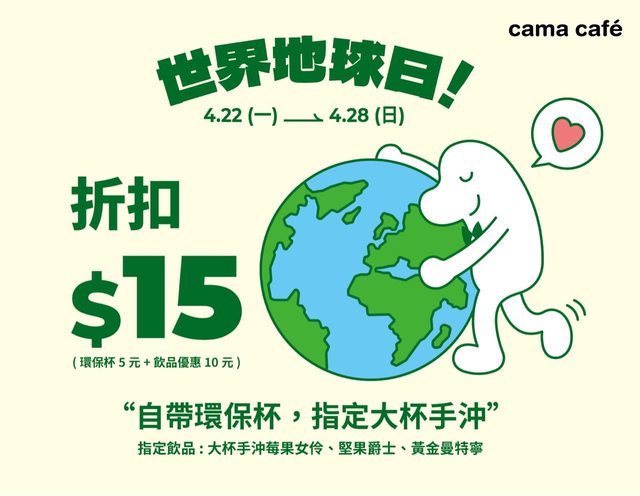 活動內容 : 凡自帶環保杯購買指定飲品享15元折扣