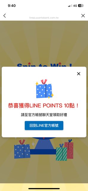 消費完沒多久就會在元大的line個人化訊息收到抽獎的轉盤,可以馬上獲得點數~