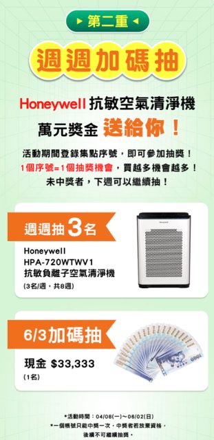 抽獎是每週都會抽Honeywell抗敏空氣清淨機 3台,共8周