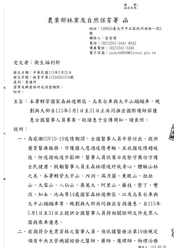 國家森林遊樂區~護理及其他醫事夥伴5/1-5/31免票入園 為強化我國的醫療體系照護人力資源,打造護理及其他醫事夥伴身心靈健康,#衛生福利 部 與林業及自然保育署合作,自5月1日至31日舉辦「醫事人員 ‧ 國家森林遊樂區免票 入園活動」 《醫療法》第10條涵蓋的 #醫事人員 (領有中央主管機關核發之醫師、藥師、護理師、物 理治療師、職能治療師、醫事檢驗師、醫事放射師、營養師、助產師、臨床心理師、諮商 心理師、呼吸治療師、語言治療師、聽力師、牙體技術師、驗光師、藥劑生、護士、助產 士、物理治療生、職能治療生、醫事檢驗生、醫事放射士、牙體技術生、驗光生及其他醫 事專門職業證書的人員) #持相關證明文件 即可免費進入台灣14處國家森林遊樂區,以及 免費搭乘烏來觀光台車與宜蘭太平山蹦蹦車! https://www.facebook.com/photo/?fbid=845286967637685&set=a.344686807697706 -- ※ 發信站: 批踢踢實業坊(ptt.org.tw), 來自: 118.232.64.143 (臺灣) ※ 文章網址: https://ptt.org.tw/Lifeismoney/M.1714377791.A.CBE
