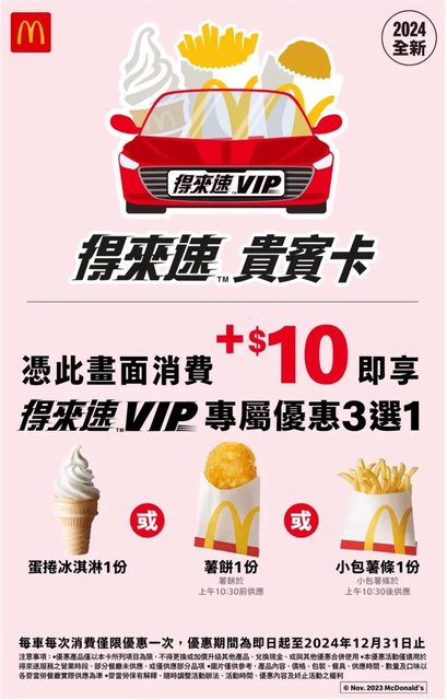 但現在麥當勞得來速只要一台車就可以加10元購買蛋捲冰淇淋/薯餅/小包薯條。