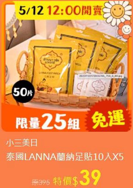 Y拍天天12:00限量搶商品 https://reurl.cc/GjKmRA [小三美日]泰國蘭納足貼(10片入)*5包$39元 https://reurl.cc/2YEr9m 不知道是不是即期品就是了 -- ※ 發信站: 批踢踢實業坊(ptt.org.tw), 來自: 111.250.13.75 (臺灣) ※ 文章網址: https://ptt.org.tw/Lifeismoney/M.1715472992.A.F23
