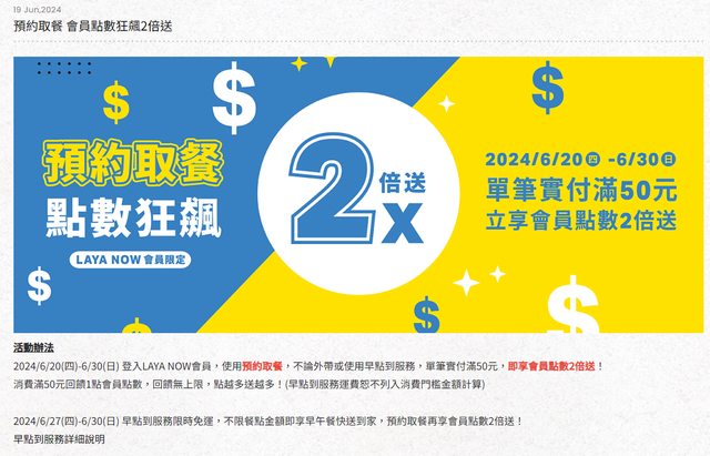 6/20~6/30登入LAYA NOW會員,要使用「預約取餐」才有哦! 不論外帶或使用早點到服務 單筆實付滿50元,即享會員點數2倍送 消費滿50元回饋1點會員點數 回饋無上限,點越多送越多 (早點到服務運費恕不列入消費門檻金額計算) 以上,提供給大家參考 -- ※ 發信站: 批踢踢實業坊(ptt.org.tw), 來自: 39.10.50.219 (臺灣) ※ 文章網址: https://ptt.org.tw/Lifeismoney/M.1719299345.A.512