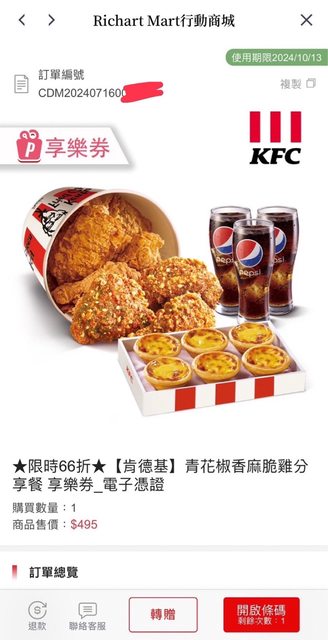 剛看richart life上面點數換肯德基有便宜就用台新點換了一個分享餐 6塊雞+蛋塔禮盒+3杯可樂$495 換算下來66折比拿點數折帳單還優 https://i.imgur.com/Ag3PIO6.jpeg