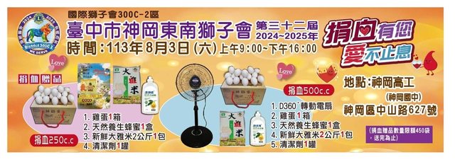 8/3(六):台中神岡高工 09:00~16:00 送雞蛋1箱、蜂蜜、白米、清潔劑/加贈電扇