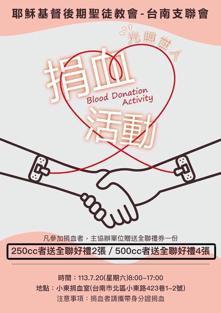 7/20(六):台南小東捐血室 08:00~17:00 送全聯禮券$200/$400