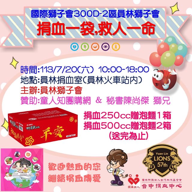 7/20(六):彰化員林捐血室 10:00~18:00 送泡麵一箱/二箱