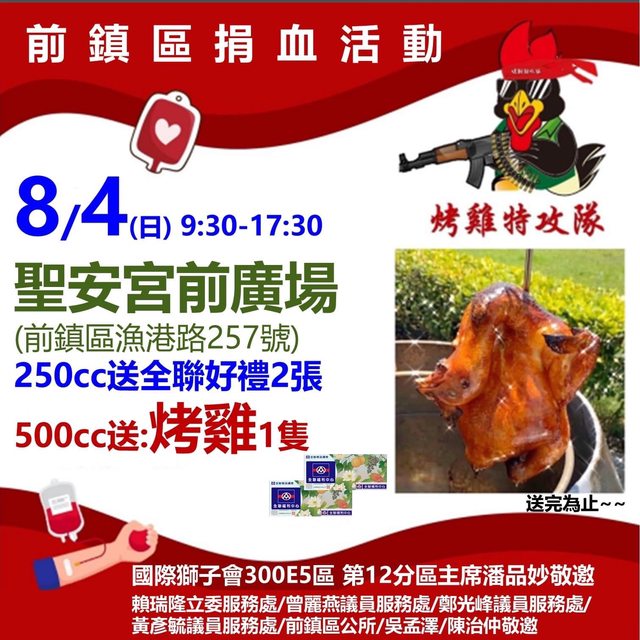 8/4(日):高雄前鎮漁港路257號 09:30~17:30 送全聯禮券$200/烤雞一隻