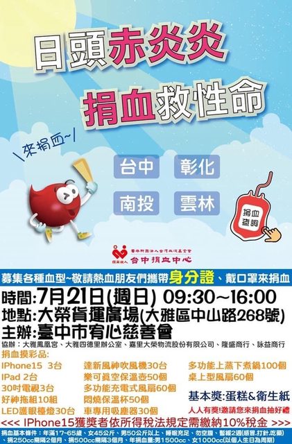 〝〝〝台中捐血中心臉書粉絲團:https://www.facebook.com/tcblood〞〞〞