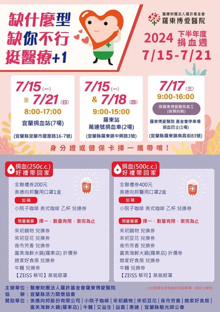 7/15~21(日):宜蘭捐血站 08:00~17:00 送全聯禮券$200、口罩/加倍送等好禮