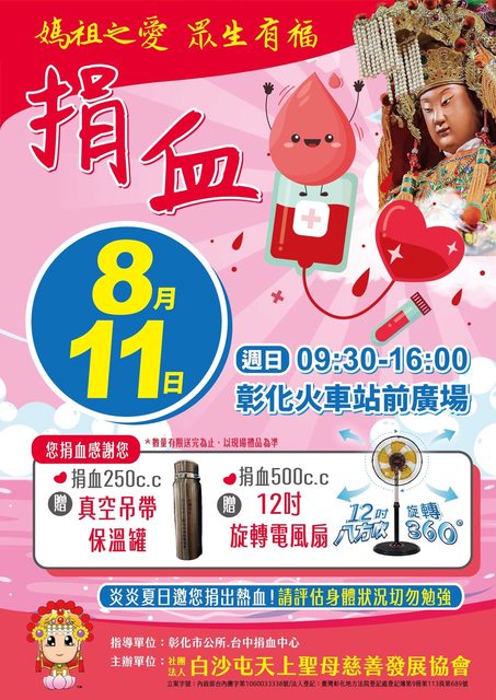 8/11(日):彰化火車站前廣場 09:30~16:00 送保溫罐/12吋電扇