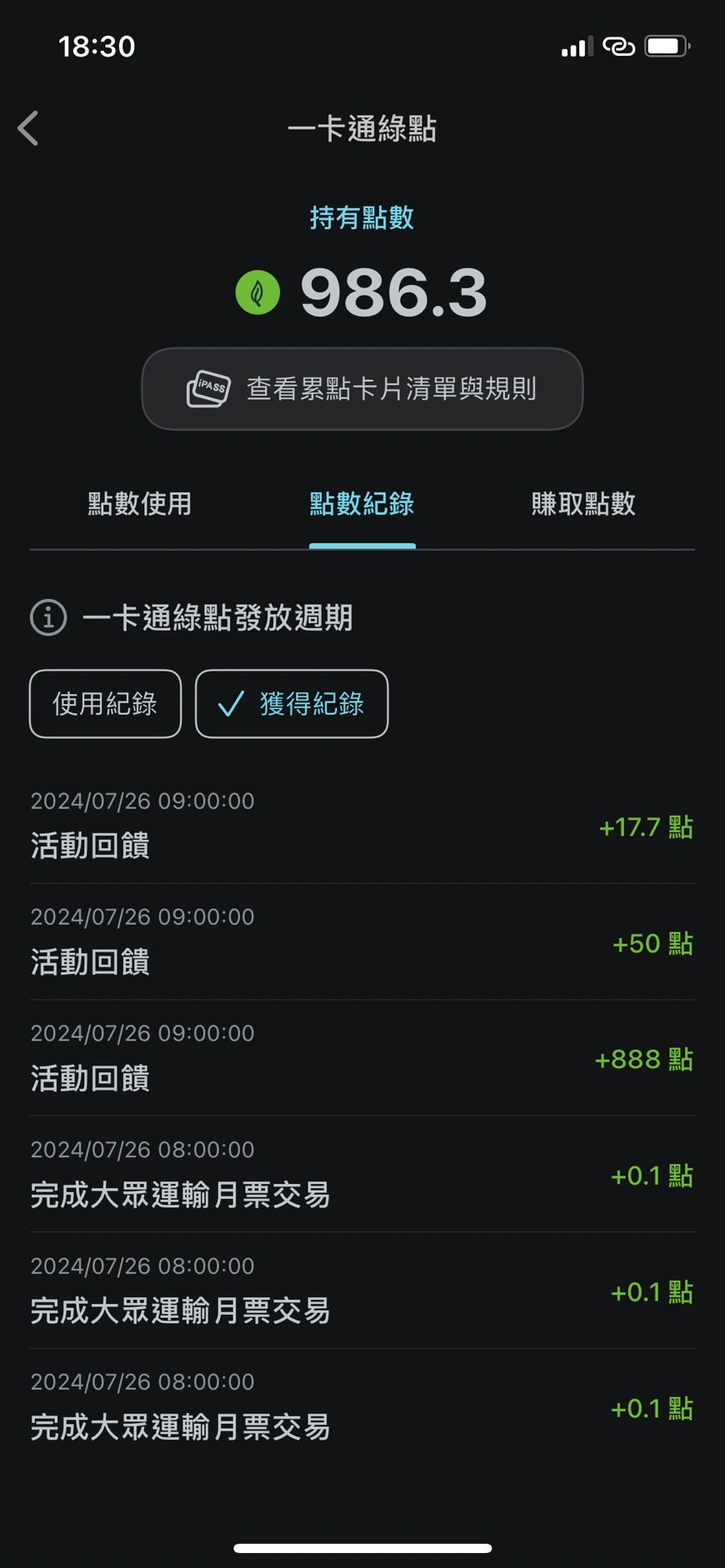 : 加入綠點、持有一卡通定期票且有交易->50點