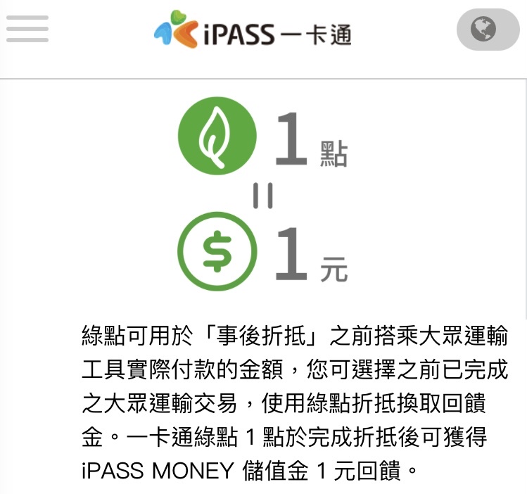 : 的交通搭乘交易紀錄),先搭乘、再折抵兌換 iPASS MONEY 儲值金,1 點相當於新台幣