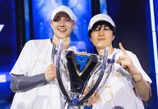 T1下路正副兩輔助,Keria跟Rekkles奪冠後的合照