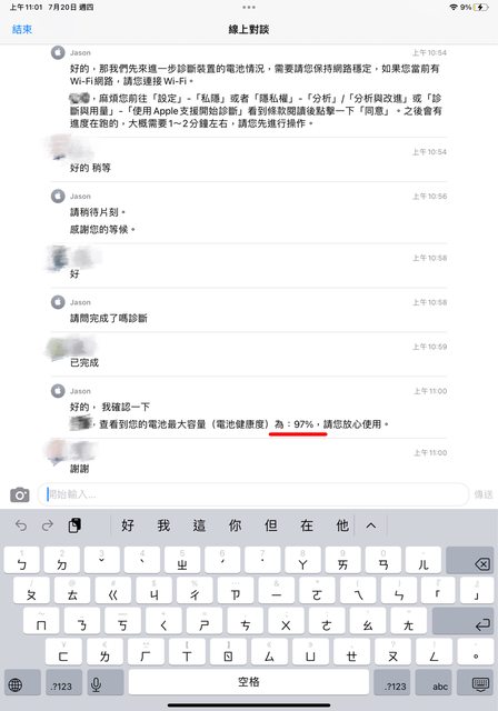 平常鮮少使用,07/20原廠測試電池健康度97%
