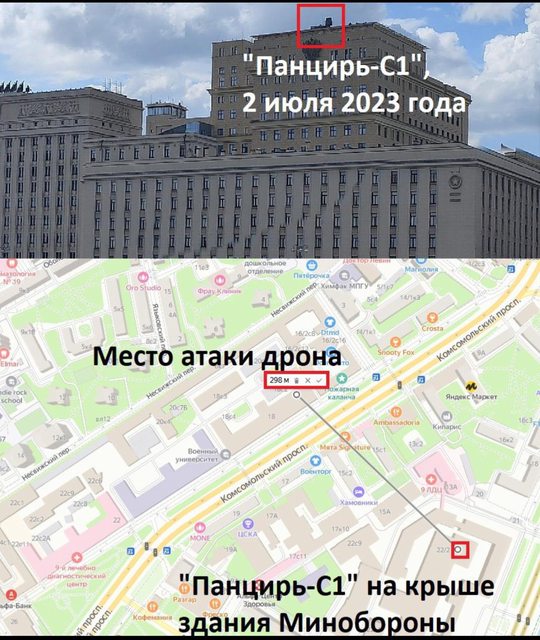 俄羅斯聯邦國防部屋頂上的“鎧甲”未能擊落這架無人機,