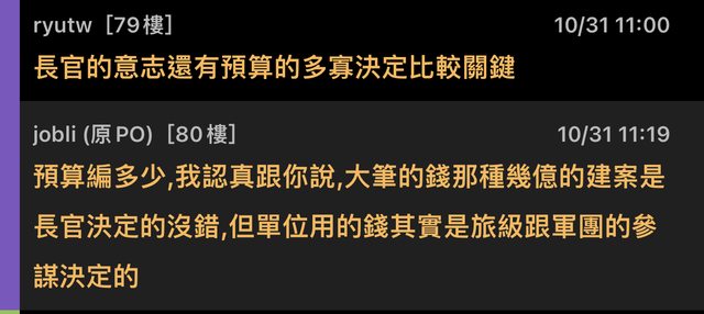 → airforce1101: 基層軍、士、兵並不會接觸多複雜預算 10/31 20:21