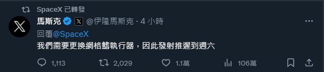 壞消息 由於需要更換格柵鰭片的致動器 馬斯克宣布延後一天 https://i.imgur.com/YdGga0N.png