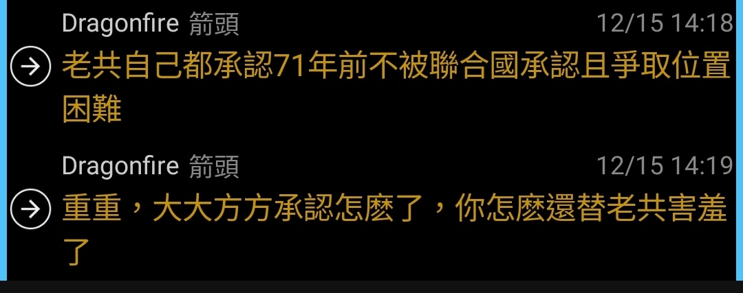 → Dragonfire : 老共自己都承認71年前不被聯合國承認且爭取位置困難 12/15 14:18