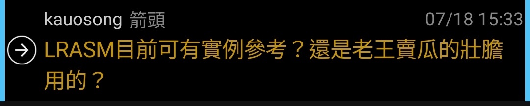 → kauosong : LRASM目前可有實例參考?還是老王賣瓜的壯膽用的? 07/18 15:33