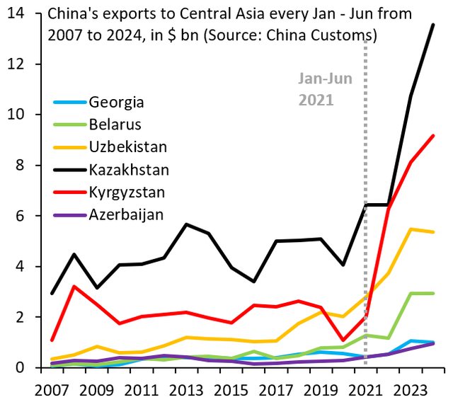 中國也透過哈薩克(黑色)、吉爾吉斯