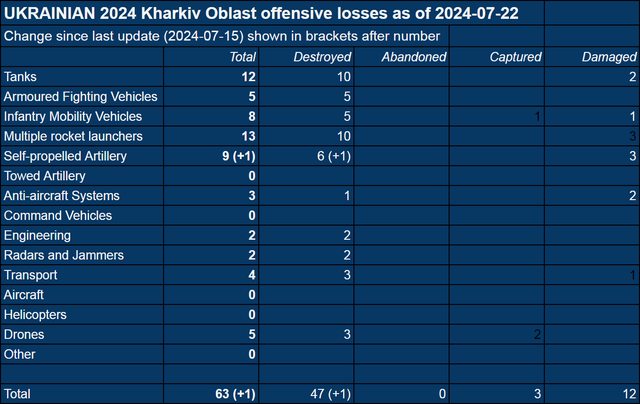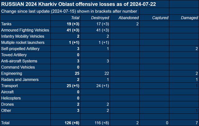 Kharkiv截至2024年7月22日確認裝備損失