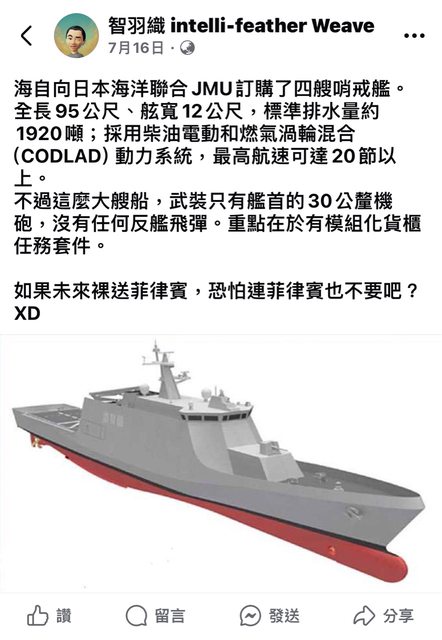 → scotch : 那還是該給海巡,海軍就是該乖乖有防空有反艦有反潛07/31 21:56