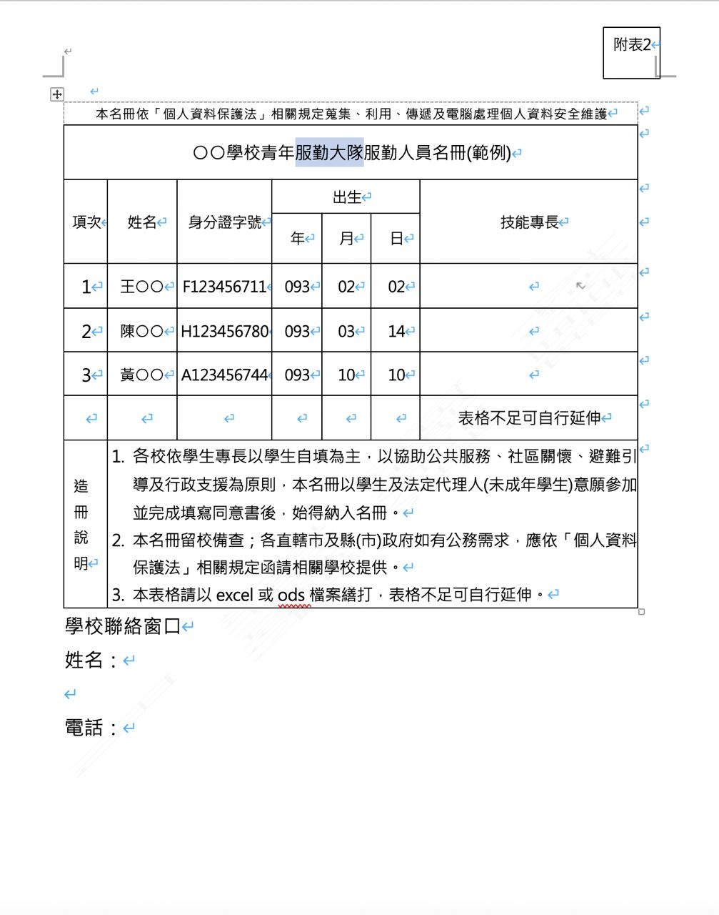 : 依學生「意願」參加,並提供「參加學校青年服勤(含個資提供)同意書」範本,在不影