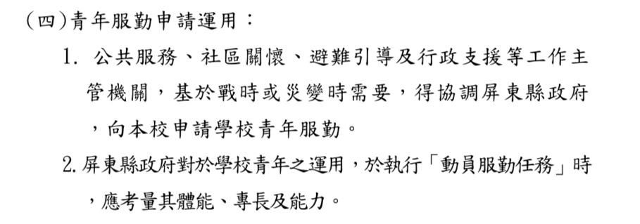 → afv : 然後網路上找到的屏東科技大學的青年服勤內容規劃 10/18 15:18