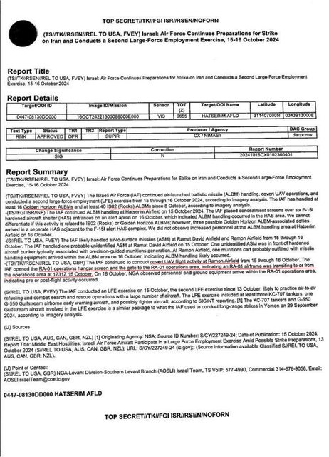 文件2:國家地理空間情報局評估 本報告評估了以色列針對伊朗的軍事活動的各種指標 重點關注武器部署防空 地面部隊和無人機行動 主要評估包括: 武器部署空基彈道飛彈和精準導引彈藥的處理能力為中低 空中行動:在中低空觀察到高空飛彈防禦 隱蔽無人機飛行和飛機疏散防禦 地面部隊:與伊朗代理人有關的行動有限 主要是防禦性的 特種部隊:對外行動的準備工作處於中等水平 表示潛在的打擊準備就緒 海軍:沒有觀察到重大的海軍行動 但防禦措施已經到位 核子武器與飛彈力量:沒有重大部署或顯示準備進行核打擊 https://reurl.cc/4dVnqXhttps://i.imgur.com/ZVKbqfT.jpeg